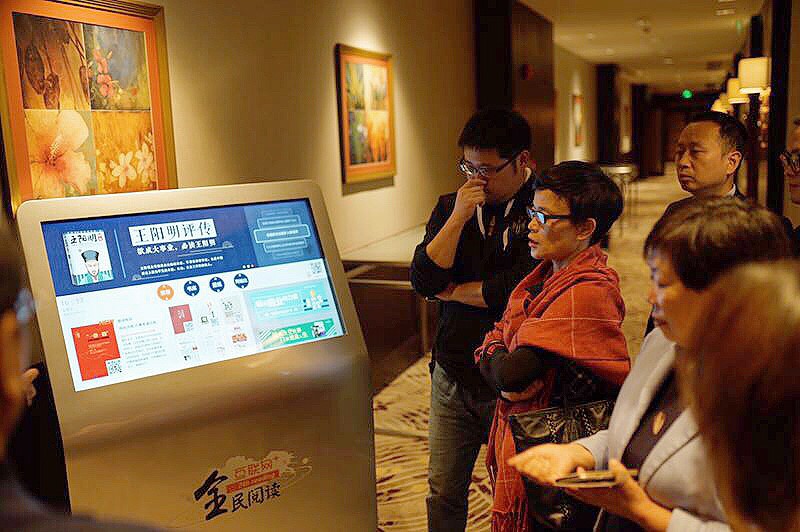 ↑圖為到場(chǎng)嘉賓駐足觀(guān)看方正愛(ài)讀愛(ài)看觸摸屏